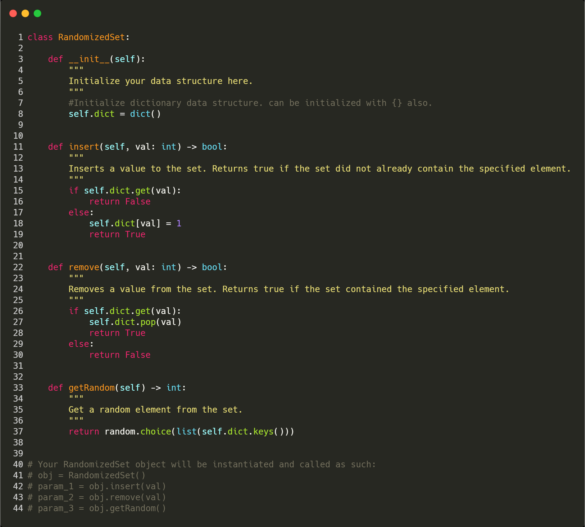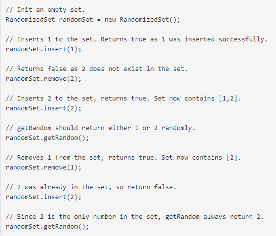 - getRandom: Returns a random element from current set of elements. Each element must have the same probability of being returned.