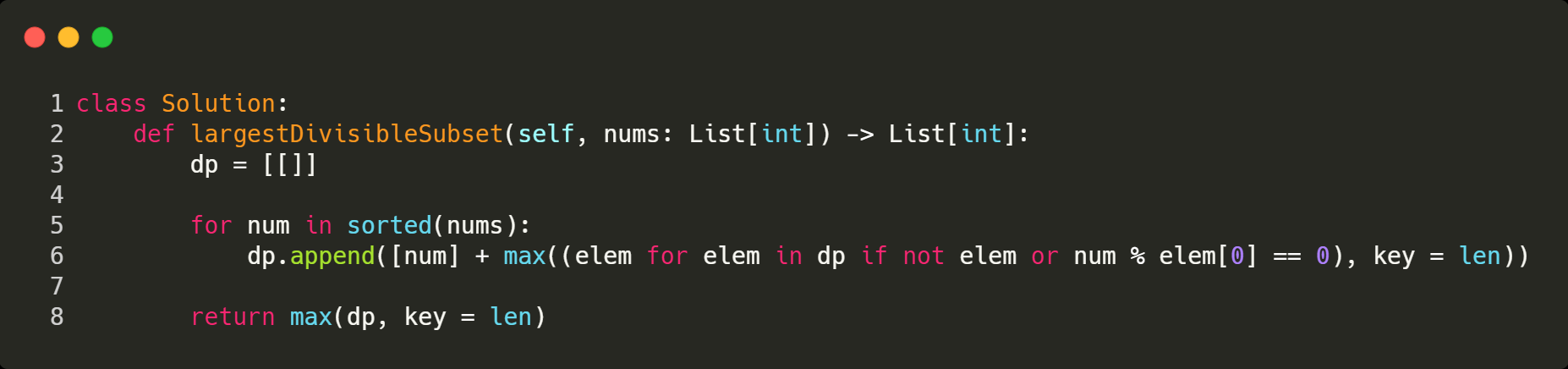 4. dp = [[], [1], [2,1], [4,2,1]] --> since 4 is divisible by 2 and [2,1] is maximum length of the list, we append to dp.