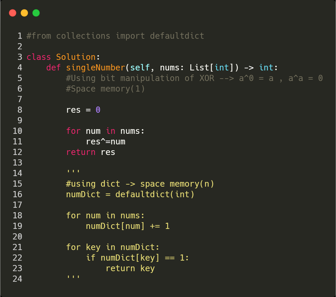 처음엔 defaultdict 를 새로 만들어서 approach 하였는데, 답을 보니 bit operation으로 extra memory 없이 가능한 방법이 있었다. 오늘도 공부하면서 배운다.