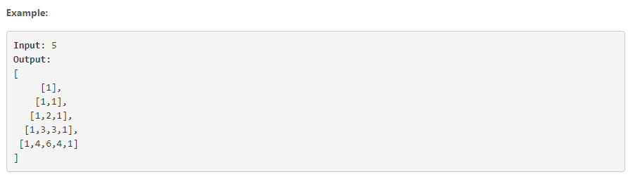 Time Complexity: O(numRows^2) --> double loop, the inner loop needs to be computed for each row.