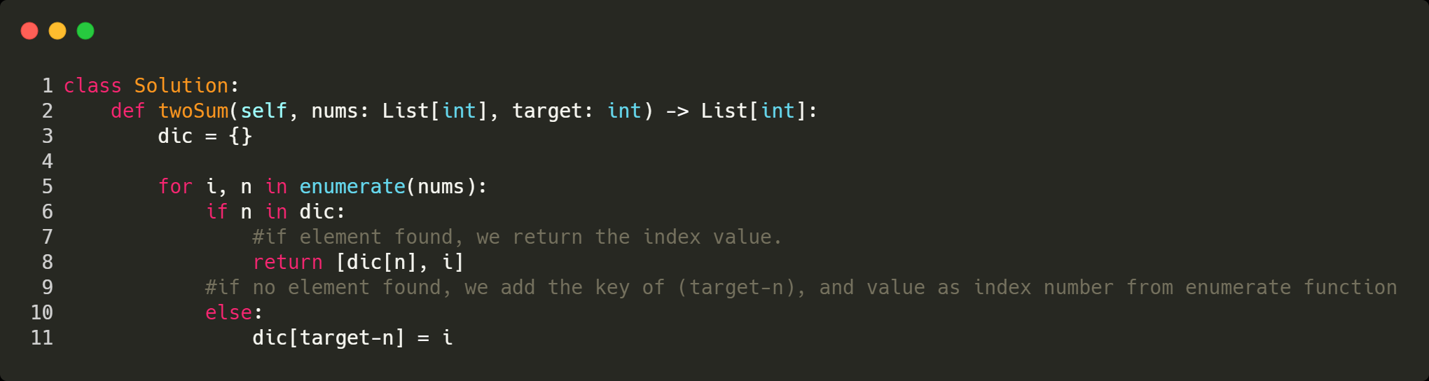 3. 없을경우에는 그 숫자의 뺀값을 키로 넣어주고, value는 enumerate function의 index 값을 넣어줌.