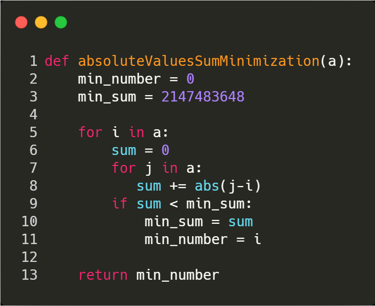 Given a sorted array of integers a, your task is to determine which element of a is closest to all other values of a. In other words, find the element x in a, which minimizes the following sum:abs(a[0] - x) + abs(a[1] - x) + ... + abs(a[a.length - 1] - x)