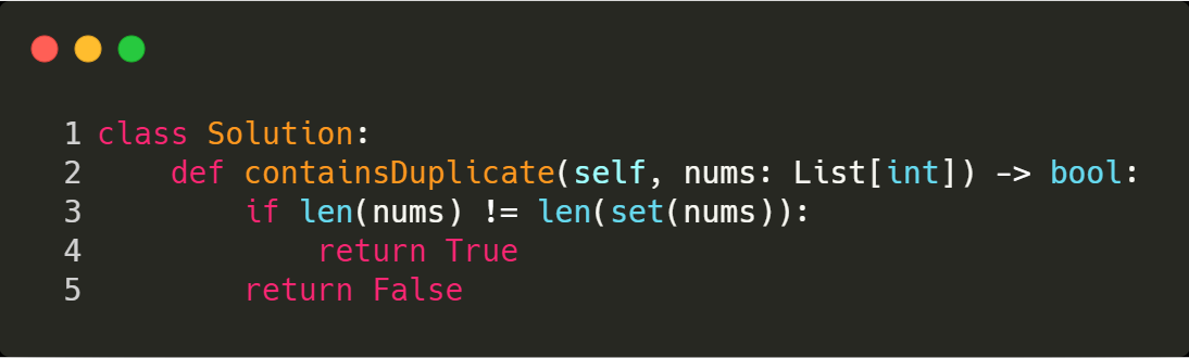 1. Compare the length of the original nums list and length of set(nums). If those two length are different, then nums list contains the duplicate number. (Since set does not allow the duplicate number).