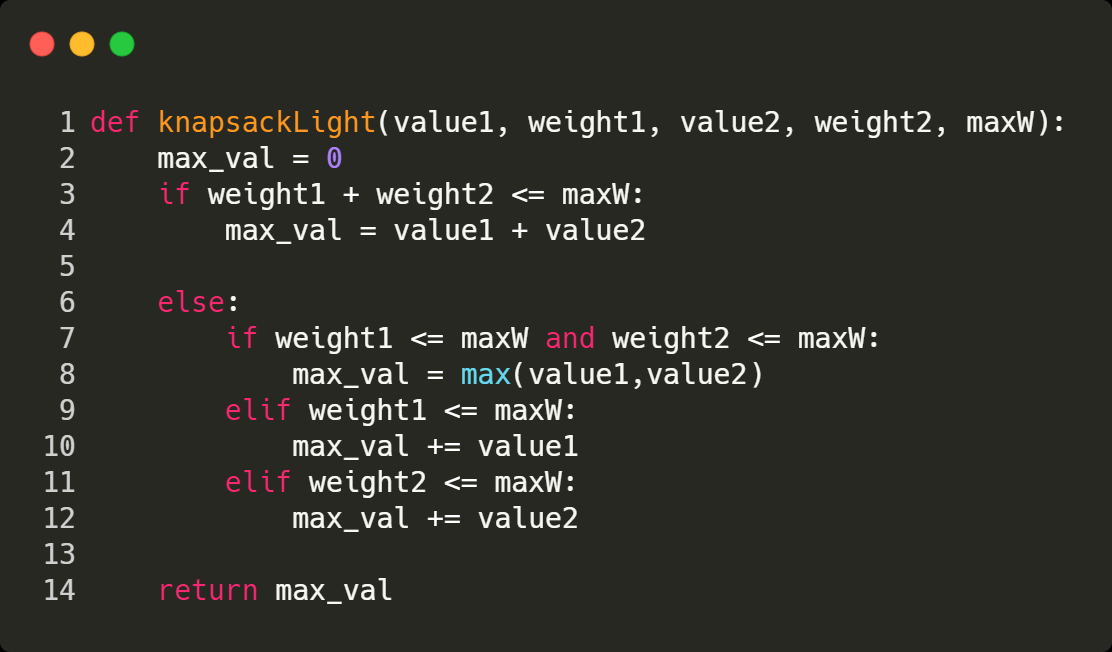 knapsackLight(value1, weight1, value2, weight2, maxW) = 16.You're strong enough to take both of the items with you.