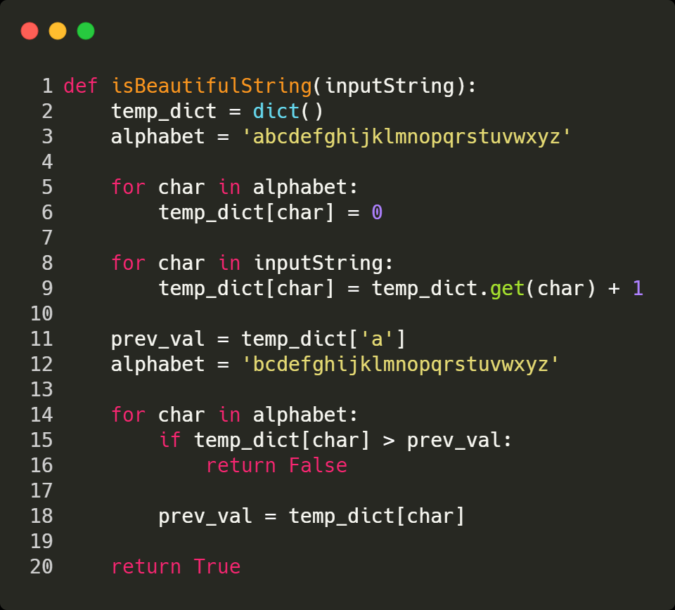For inputString = "bbbaacdafe", the output should be isBeautifulString(inputString) = true.