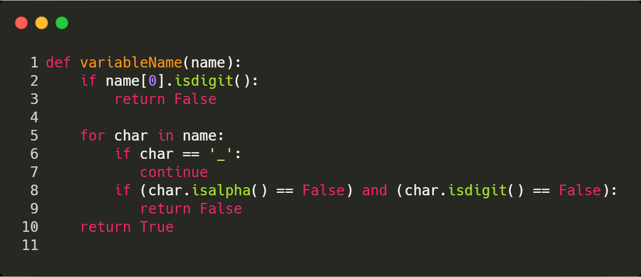 1. name 안에 있는 each character 들에 대하여 for loop을 돌기전에 먼저 name 안에 제일 처음 단어가 숫자인지 확인해준다. 만약 숫자일 경우 바로 False를 리턴.