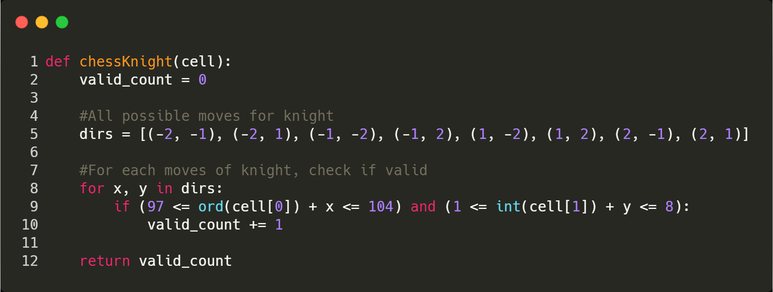 Given a position of a knight on the standard chessboard, find the number of different moves the knight can perform.