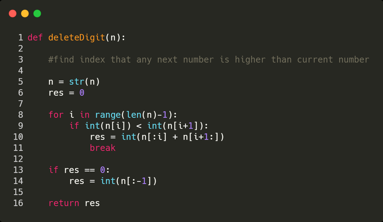 deleteDigit(n) = 52; - For n = 1001, the output should be