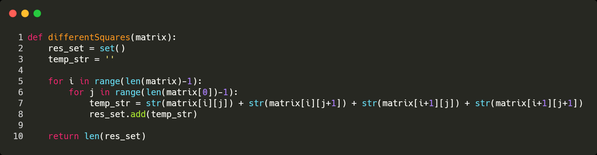 Given a rectangular matrix containing only digits, calculate the number of different 2 × 2 squares in it.
