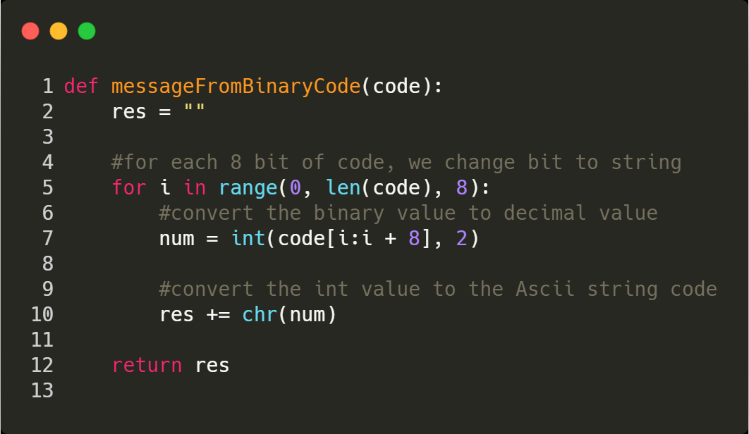 1. For every 8 bits of code, change the bit to string by using int(number, base=2)
