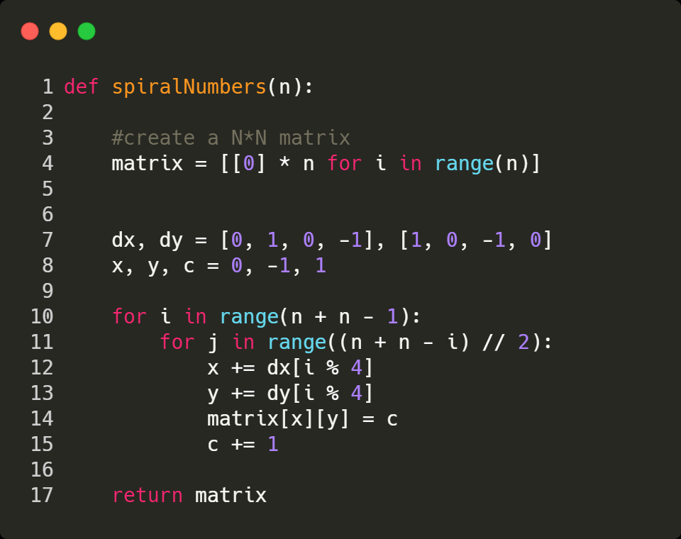 Construct a square matrix with a size N × N containing integers from 1 to N * N in a spiral order, starting from top-left and in clockwise direction.