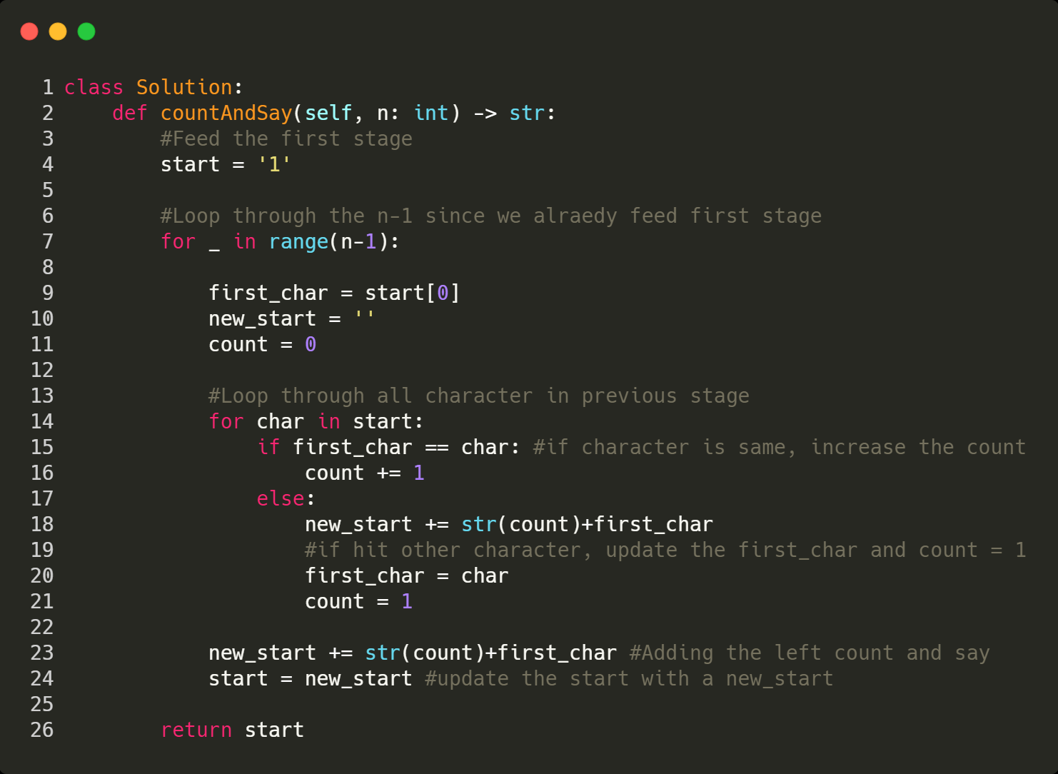 Given an integer n where 1 ≤ n ≤ 30, generate the nth term of the count-and-say sequence. You can do so recursively, in other words from the previous member read off the digits, counting the number of digits in groups of the same digit.