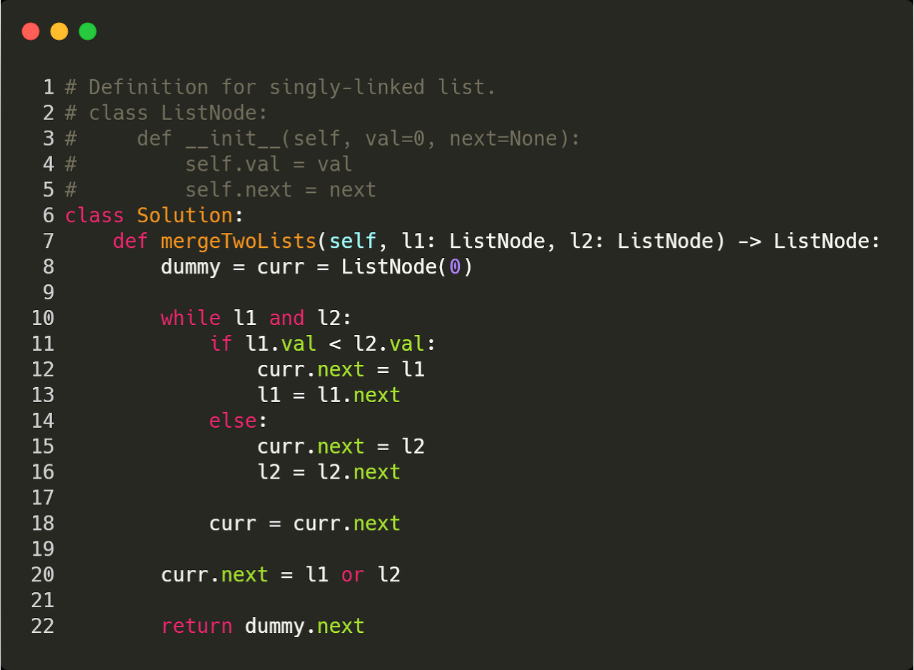 def mergeTwoLists(self, l1: ListNode, l2: ListNode) -> ListNode: