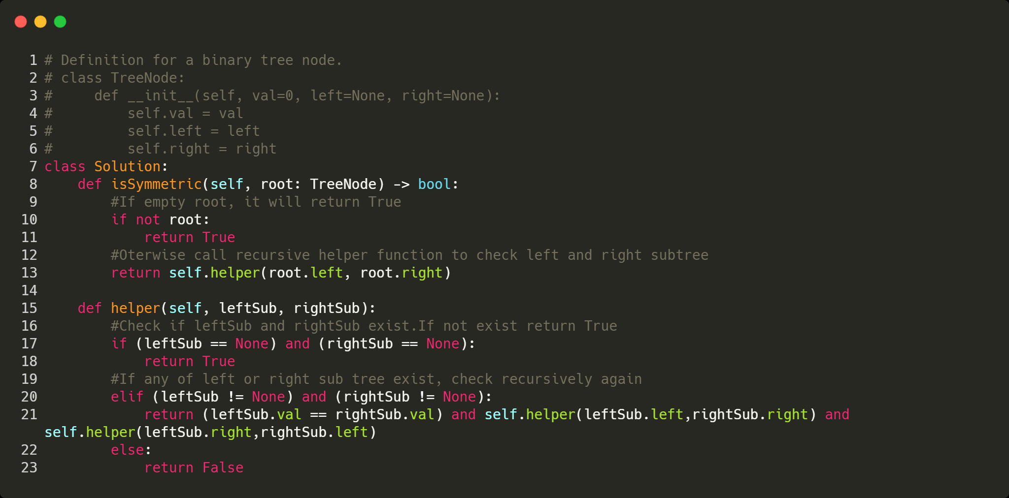 Given a binary tree, check whether it is a mirror of itself (ie, symmetric around its center).