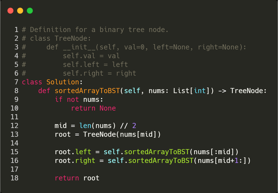 1. First, find a root first by finding the midpoint of the given integer array.