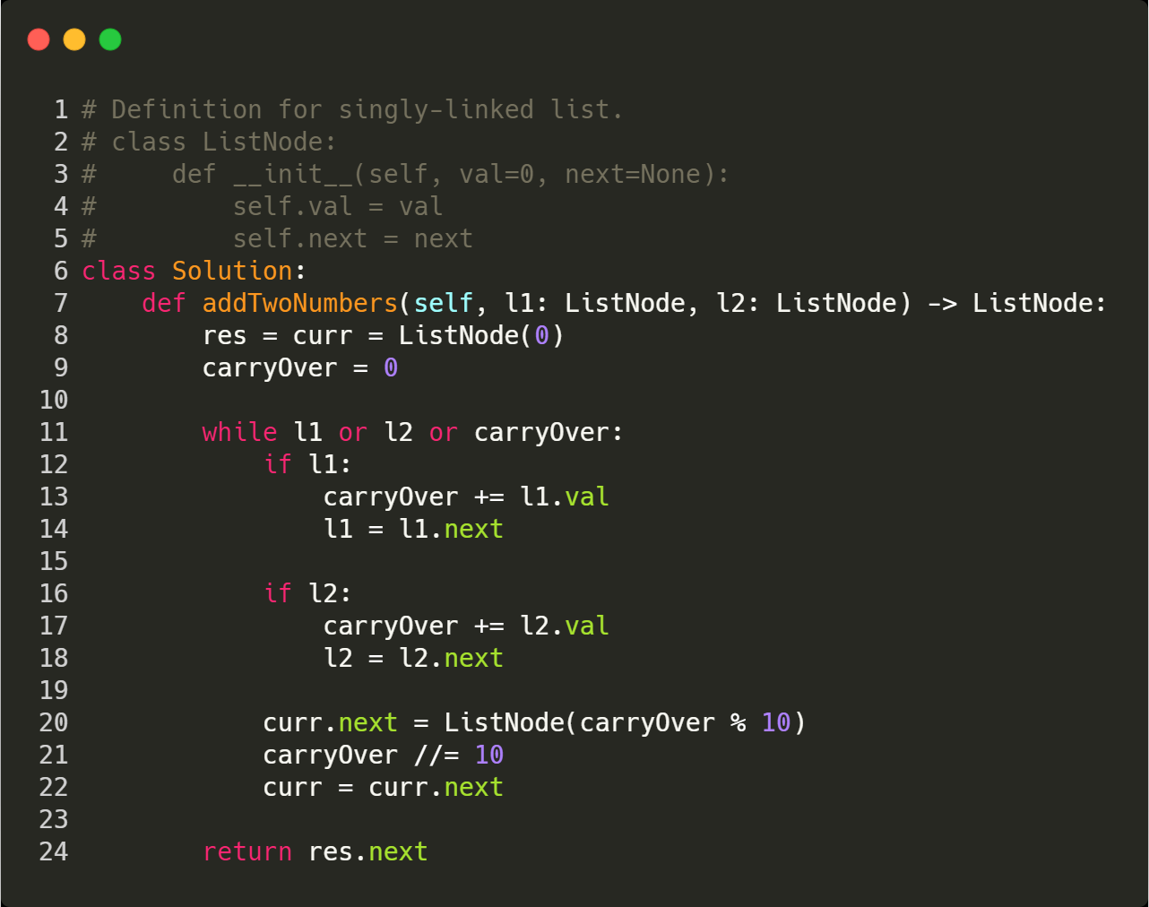 def addTwoNumbers(self, l1: ListNode, l2: ListNode) -> ListNode: