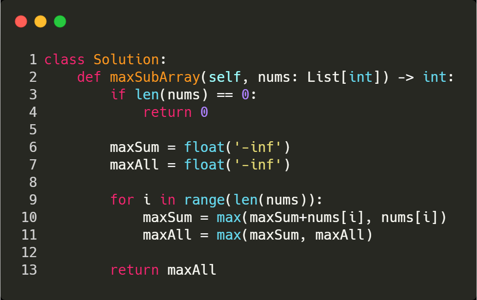 1. Find the maximum sum by comparing adding previous sum + current index number, and only the current index number.