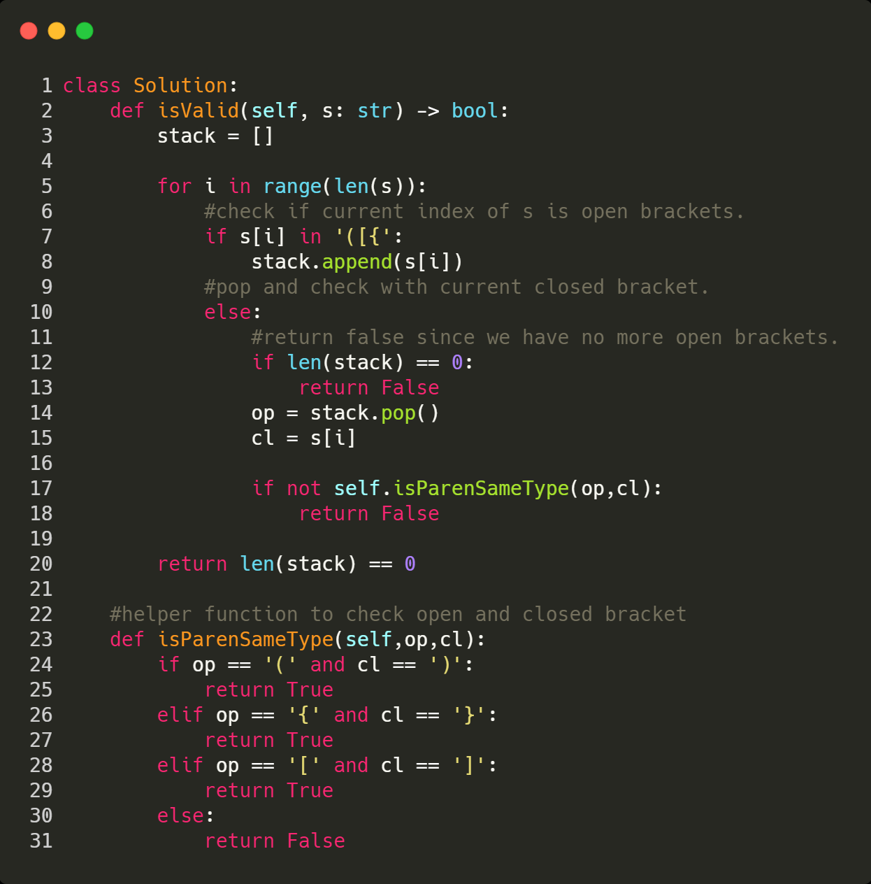 2. Otherwise, we pop from the stack and compare it with the current closed bracket. (If match, keep continue, otherwise return False)
